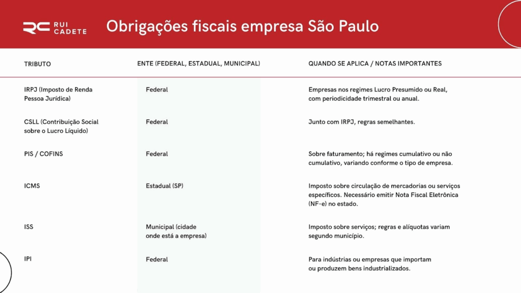seguir, os principais tributos que fazem parte das obrigações fiscais empresa São Paulo: